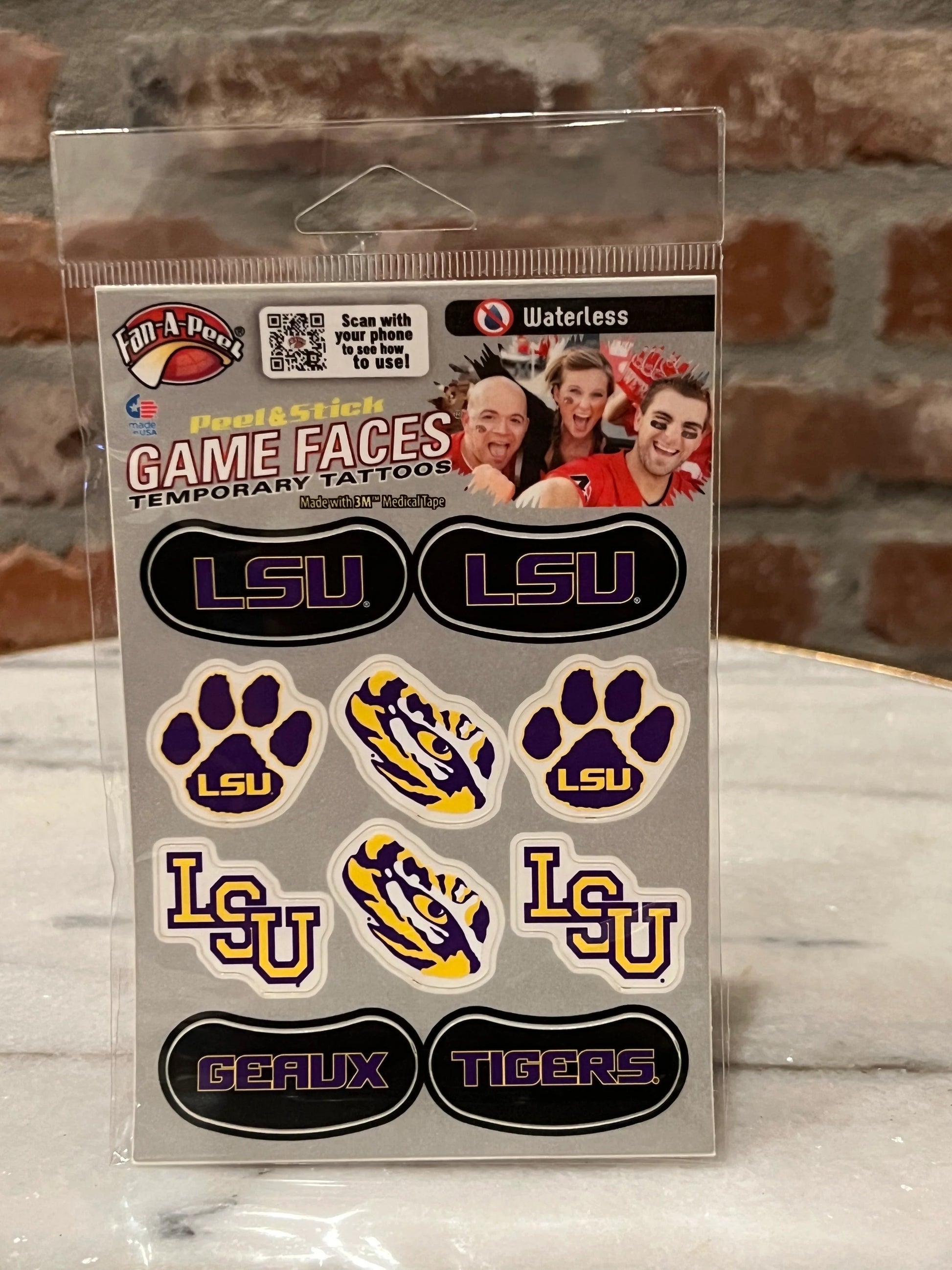 • 1 LSU Game Faces Temporary Tattoos package (contains 10 tattoos, great for Game Day!)