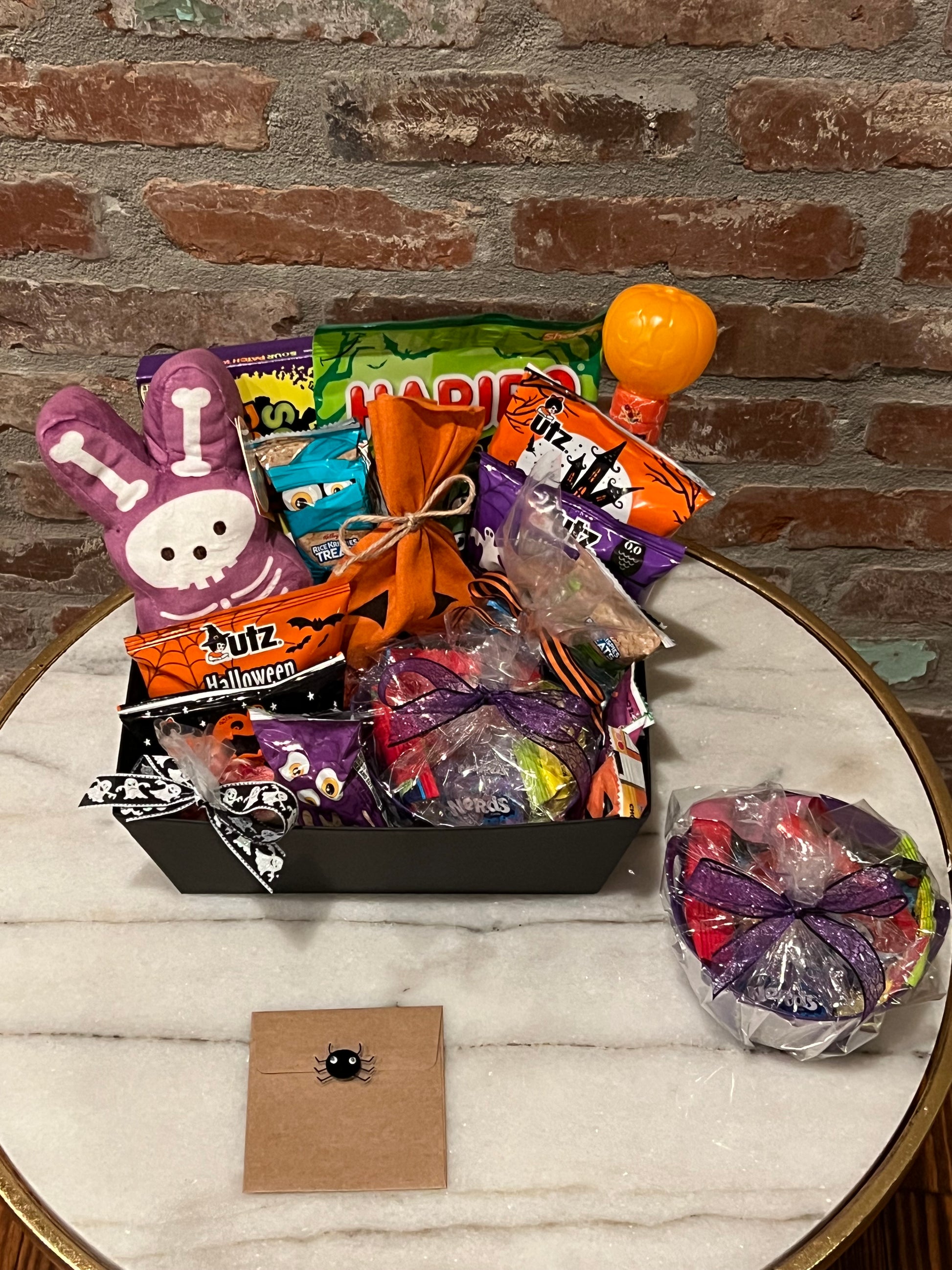 • 1 "Happy Halloween" Small Cauldron with various candy (Nerds, Skittles, Airheads, Life Savers Gummies, Twizzlers, Sour Patch Kids, Starburst, Trolli Sour Brite Crawlers)